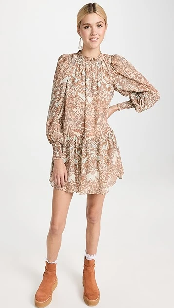 Relaxed yet romantic, this lightweight Ulla Johnson dress is detailed with intricate patterning in a muted color scheme, as well as flecks of metallic thread. Puff shoulders accentuate the gently voluminous look of the silhouette. To round out your outfit, add a favorite pair of suede booties.
