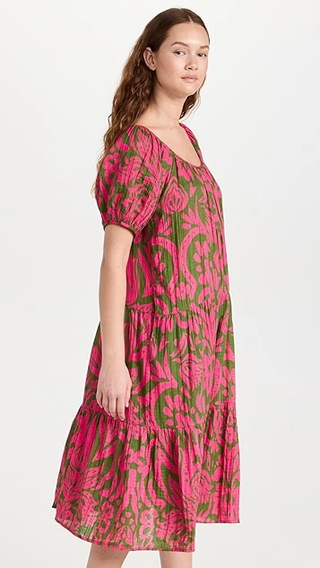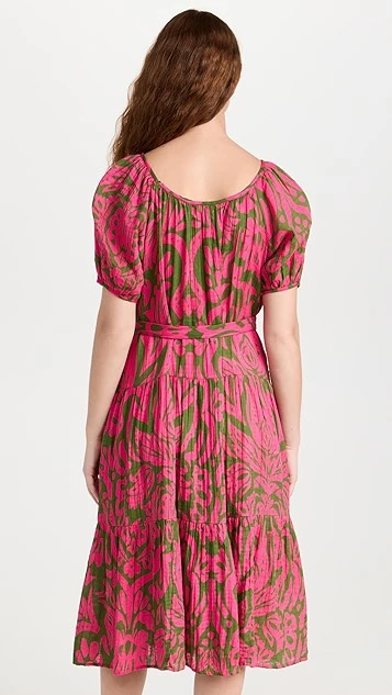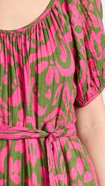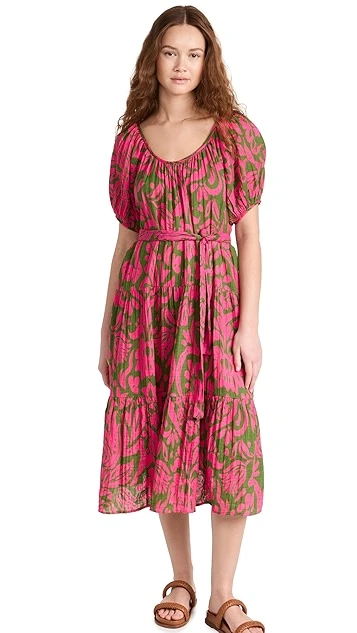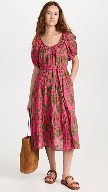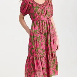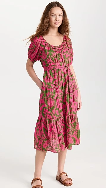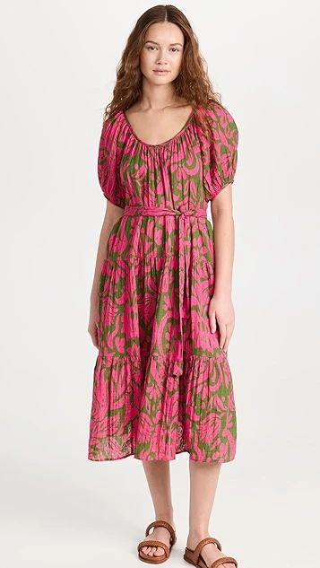A lovely and lightweight Velvet midi dress in pure cotton, detailed with a bright abstract print and finished with waist-defining ties. If you’re in the mood to accessorize, add a beaded necklace at the scoop neckline.