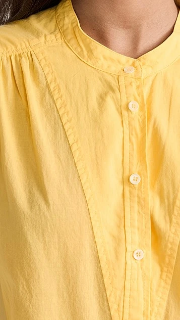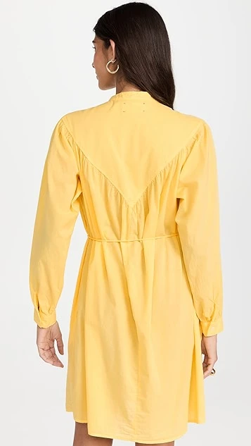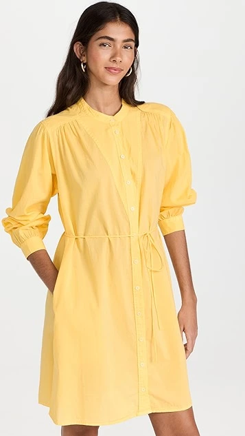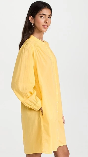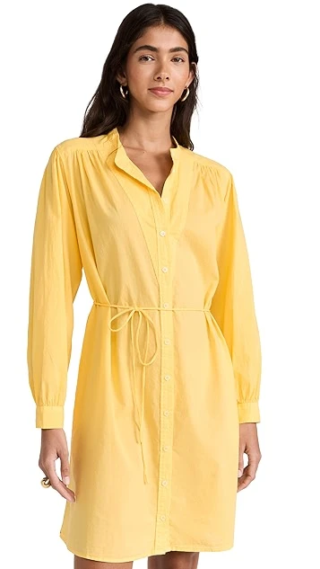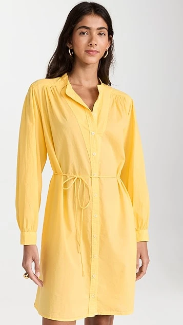 A collarless XIRENA shirtdress, featuring warm color and crisp fabric. Optional thin ties accentuate the waist, and a V-shaped back panel provides an understated touch of signature style.