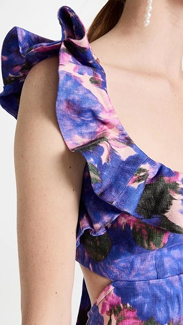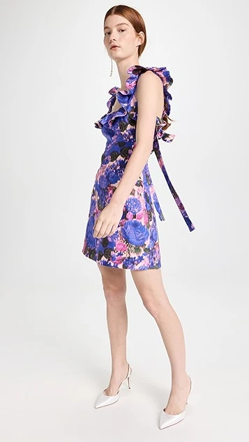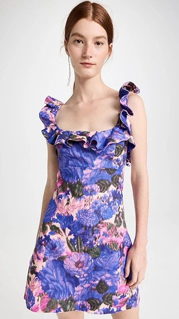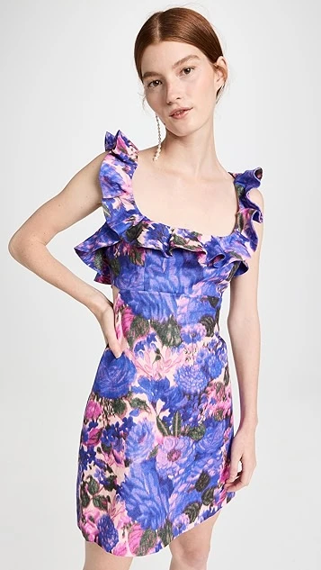 Lovely and lavish, this tidily tailored Zimmermann mini dress is embellished with a rich floral print. Precise ruffles trace the shoulders and deep neckline. To accessorize, complement this piece with pearl earrings and strappy heels.