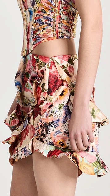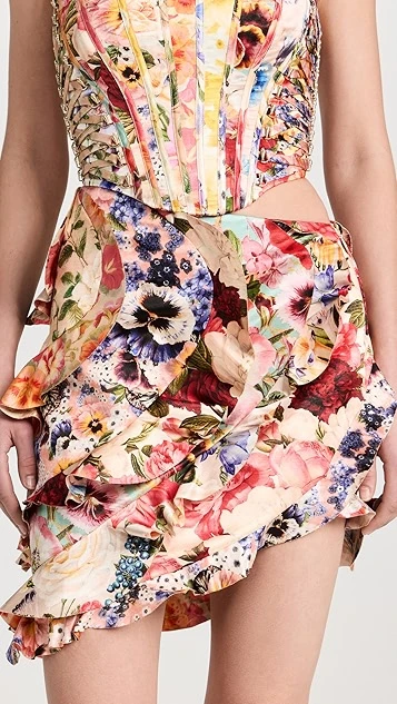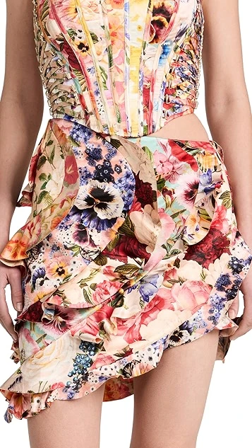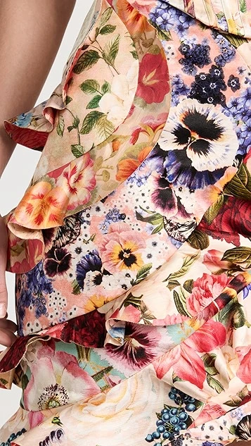 - Asymmetrical flounce trim and hem